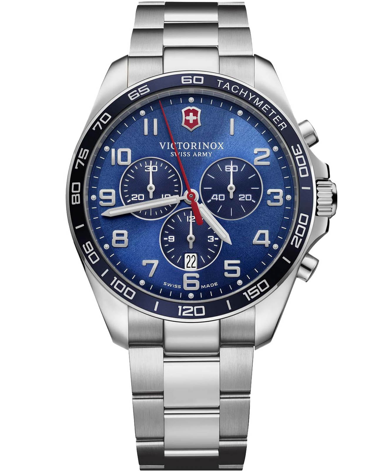 Мужские швейцарские часы-хронографХронографФункция позволяет измерять отрезки времени с особой точностью: часы, минуты, секунды. Верным признаком хронографа является наличие на циферблате 3 дополнительных окошек-счётчиков. Victorinox Fieldforce Chronograph 241901 с надёжным кварцевым механизмом. Сапфировое стеклоСапфировое стеклоПрочный и надёжный материал из кристалла сапфира синтетического происхождения, характеризующийся особой твёрдостью и устойчивостью к царапинам и повреждениям. с трёхслойным антибликовым покрытием. Корпус часов выполнен из нержавеющей стали 316L. Стальной браслет на раскладной застёжкеРаскладная застёжкаТакой тип застёжки используется только на браслетах из металла. Она никогда не раскрывается полностью, происходит разделение на 2 и более частей. Раскладывающая застёжка снизит вероятность потери часов к минимуму.. Влагозащита: 100 метров, позволит плавать, нырять и заниматься другими водными видами спорта. Окошко даты находится в положении 6 часов, стрелки и метки с люминесцентным покрытиемЛюминесцентное покрытиеПозволяет считывать показания времени в темноте. Производители наносят на стрелки, часовые индексы, безель или поверхность циферблата светонакопительный состав, дающий холодное свечение., тахиметрТахиметрРазмеченная шкала, располагается на ободке или безеле часов. Тахиметр позволяет рассчитать скорость на определённом участке пути, расстояние измеряется в километрах или милях..