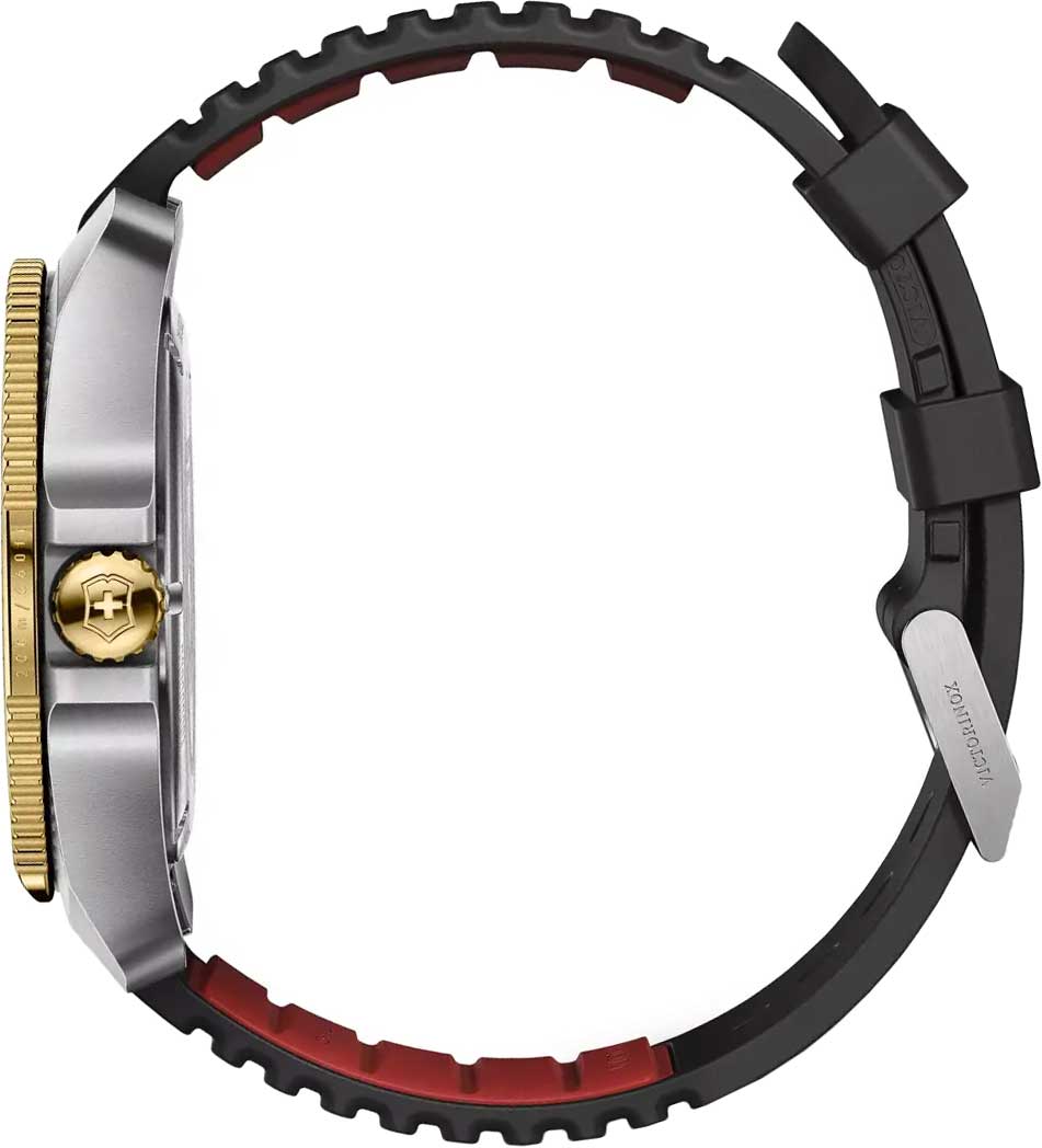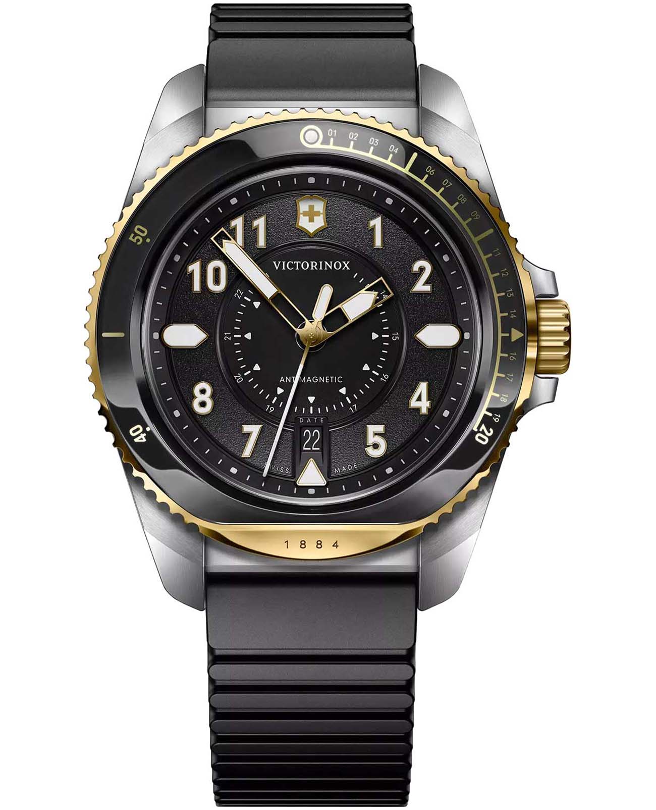 Мужские швейцарские часы Victorinox 242014. Сапфировое стеклоСапфировое стеклоПрочный и надёжный материал из кристалла сапфира синтетического происхождения, характеризующийся особой твёрдостью и устойчивостью к царапинам и повреждениям. с трёхслойным антибликовым покрытием. Корпус часов выполнен из стали. Влагозащита: 200 метров, позволит плавать, нырять и заниматься другими водными видами спорта. Стрелки и метки с люминесцентным покрытиемЛюминесцентное покрытиеПозволяет считывать показания времени в темноте. Производители наносят на стрелки, часовые индексы, безель или поверхность циферблата светонакопительный состав, дающий холодное свечение.. Окошко даты находится в положении 6 часов. БезельБезельВнешний ободок, закрепляющий стекло. В спортивных часах так называется поворотное кольцо с делениями на циферблате, выполняет роль таймера – замеряет отрезки времени на шкале. Неподвижный безель – элемент декора. Однонаправленно вращающийся безель на дайверских часах позволяет фиксировать моменты погружения и выныривания на поверхность. с PVD-покрытиемPVDУльтратонкое покрытие наносится в технике вакуумного напыления, сочетает в себе нитрид титана особой прочности со слоем золота или оксида хрома. Несёт в себе декоративную или защитную функцию.. Ремешок с классической застежкой и системой быстрой замены.