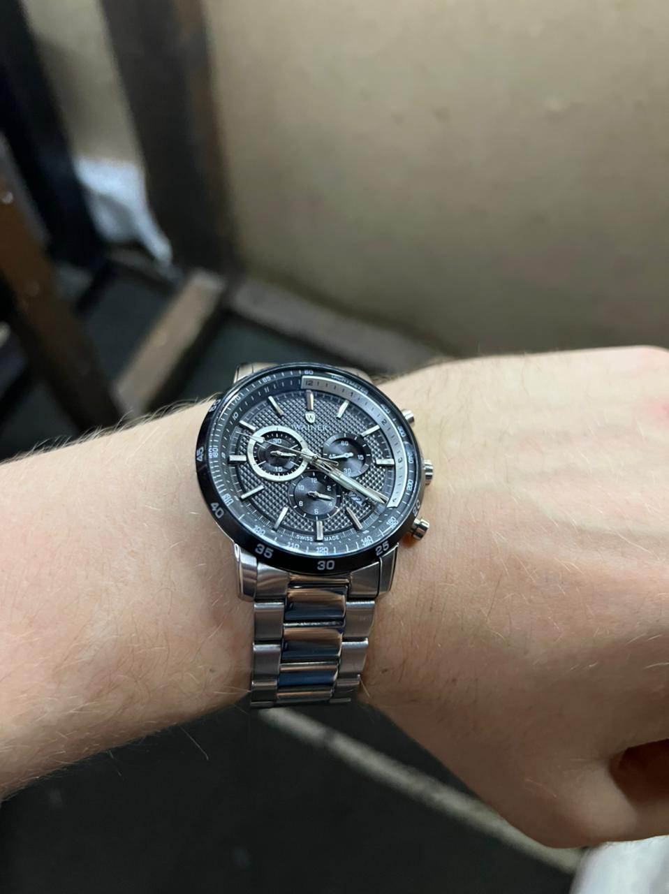 Мужские кварцевые часы Wainer из коллекции Bach — это швейцарское качество и современный дизайн. Часы оснащены механизмом RONDA 5030.D, обеспечивающим высокую точность хода. Корпус выполнен из нержавеющей стали марки 316L с PVD-покрытиемPVDУльтратонкое покрытие наносится в технике вакуумного напыления, сочетает в себе нитрид титана особой прочности со слоем золота или оксида хрома. Несёт в себе декоративную или защитную функцию. и защищён сапфировым стекломСапфировое стеклоПрочный и надёжный материал из кристалла сапфира синтетического происхождения, характеризующийся особой твёрдостью и устойчивостью к царапинам и повреждениям.. Циферблат дополнен окошком даты, указателем второго часового пояса и вынесенной секундной стрелкой. Шкала тахиметраТахиметрРазмеченная шкала, располагается на ободке или безеле часов. Тахиметр позволяет рассчитать скорость на определённом участке пути, расстояние измеряется в километрах или милях. расположена на безеле. Часы оснащены функцией хронографаХронографФункция позволяет измерять отрезки времени с особой точностью: часы, минуты, секунды. Верным признаком хронографа является наличие на циферблате 3 дополнительных окошек-счётчиков., позволяющей измерять промежутки времени. Стрелки оснащены люминесцентным покрытиемЛюминесцентное покрытиеПозволяет считывать показания времени в темноте. Производители наносят на стрелки, часовые индексы, безель или поверхность циферблата светонакопительный состав, дающий холодное свечение., что обеспечивает хорошую читаемость в темноте. Браслет из нержавеющей стали марки 316L фиксируется на раскладной застёжкеРаскладная застёжкаТакой тип застёжки используется только на браслетах из металла. Она никогда не раскрывается полностью, происходит разделение на 2 и более частей. Раскладывающая застёжка снизит вероятность потери часов к минимуму.. Водонепроницаемость 50 м.